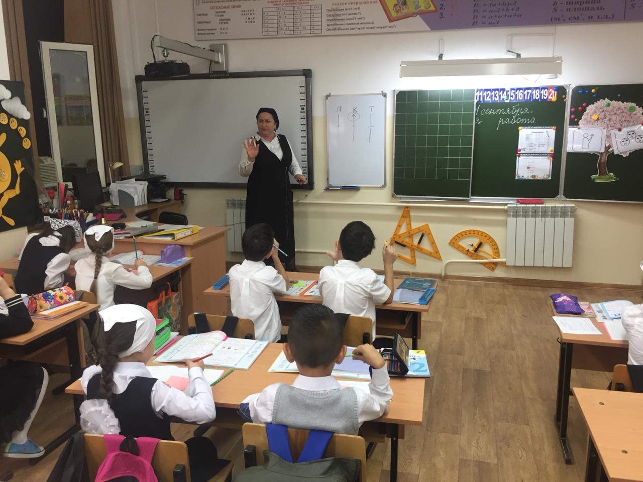 11.09.2019Сегодня учителем начальных классов Газиевой П.Ш. был проведен открытый урок с целью оказания методической помощи для молодых педагогов. Урок состоялся во 2 а классе по математике на тему "Числа 10, 100. Образование двузначных чисел". Урок был проведен с применением современных педагогических технологий, с акцентом на систему самооценивания линейками Цукермана.