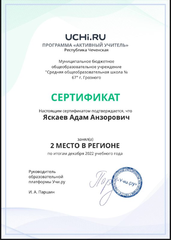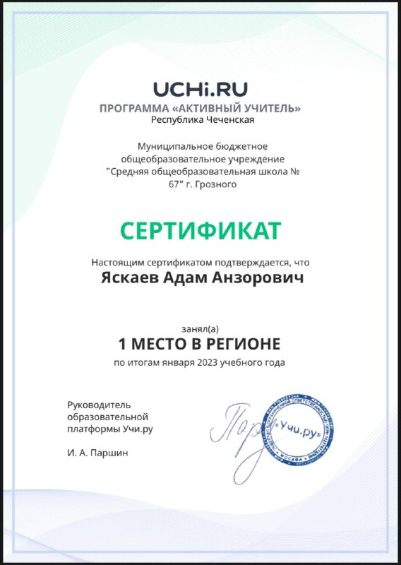 💻Самым активным участником в регионе на платформе Учи.ру, по итогам января 2023 года, был признан учитель информатики нашей школы, МБОУ “СОШ № 67” г. Грозного, Яскаев Адам Анзорович. Сертификат подписан руководителем образовательной платформы Учи.ру И.А.Паршиным. Кропотливая, систематическая интерактивная работа учителя с учениками ещё с прошлого года фиксируется на образовательной платформе Учи.ру. По итогам декабря 2022 года Адам Анзорович признан вторым самым активным интерактивным участником Чеченской Республики. Успех А.А. Яскаева служит положительным примером для обучающихся нашей школы и прививает им интерес к саморазвитию и познанию.Дала аьтто бойла, Адам Анзорович! Дала т1аьхье беркате йойла! 💻 #ГПН_2023 #ГПН2023 #ГодПедагогаНаставника #ГодПедагогаНаставникавЧР #ГодПедагогаНаставникавЧеченскойРеспубике #ГПН_Чечня_2023 #ЗелимханАхматов #ДепобрГрозный