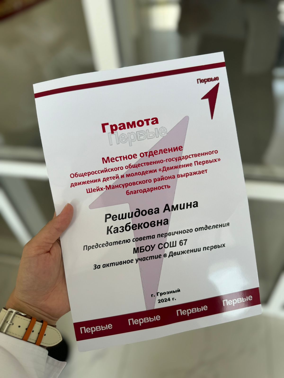 Пресс-релиз июль 2024 Ученица МБОУ «СОШ № 67» г. Грозного награждена грамотой за активную деятельность в проекте «Движение первых»